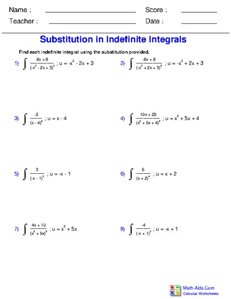 Integration By Substitution Worksheet. Web substitution method in integration practice worksheet (1) integrate the following with respect to x. Some of the worksheets for this concept are integration work, math 122 substitution and the definite integral,.